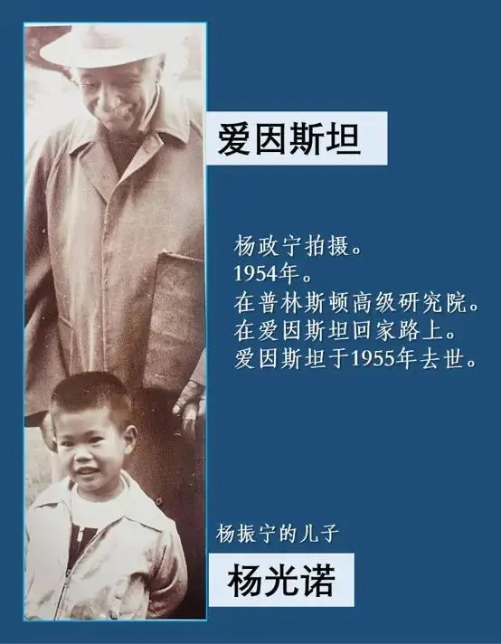 那時候,我的大兒子叫做楊光諾,有一天,我就帶他到愛因斯坦走來的路上面,就愛因斯坦說,(他認識我,我們沒有很多的交談),我跟他說,“愛因斯坦教授,這是我的兒子,你可不可以跟他照張相”,所以就照了這張相。